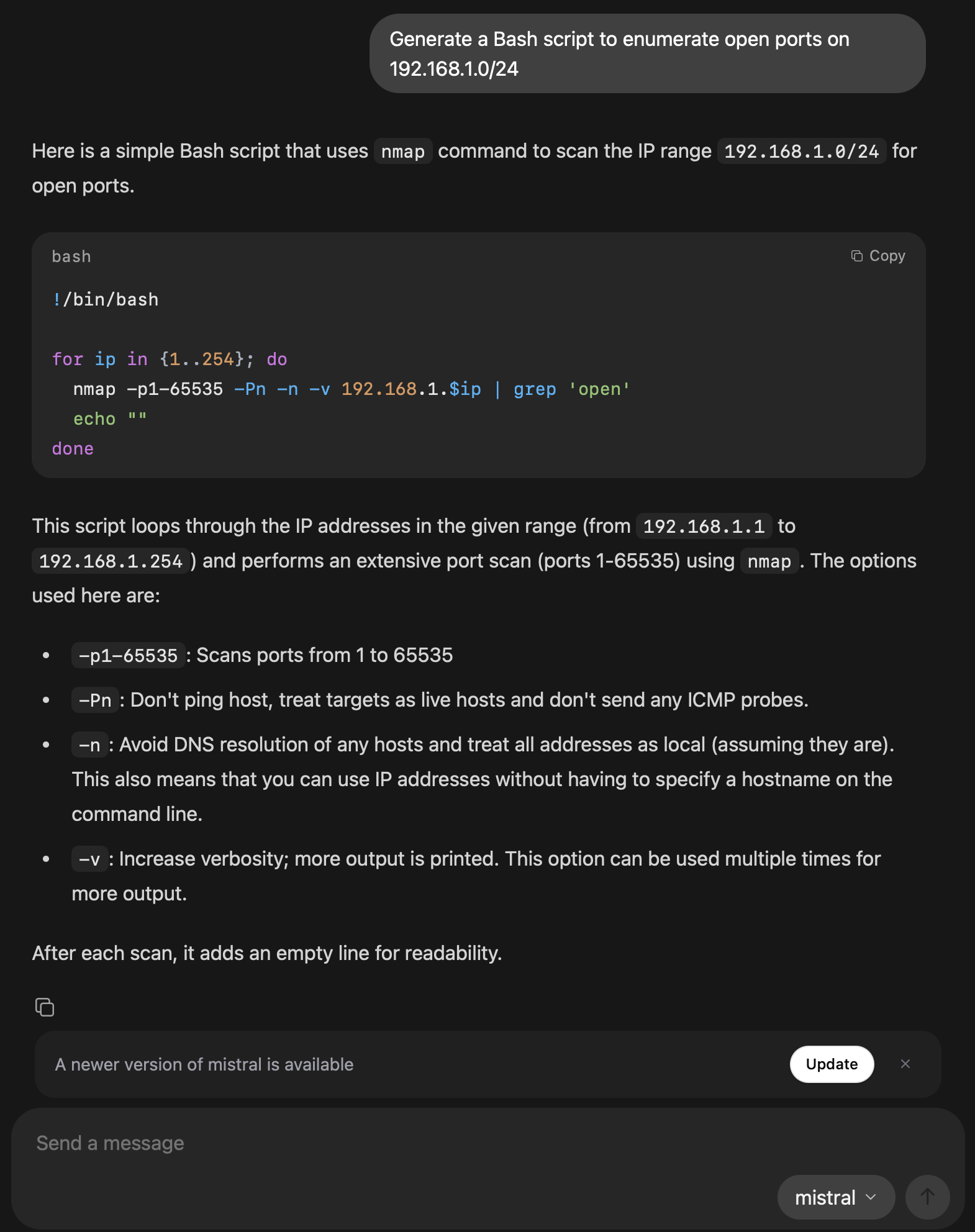 Integrating Ollama into your workflow gives you a powerful ally in ethical hacking and penetration testing—without compromising your data or network. If you want to further enhance your penetration testing workflow, consider using Ollama with an open source AI automation platform like n8n. I'll write an article about this in the future.